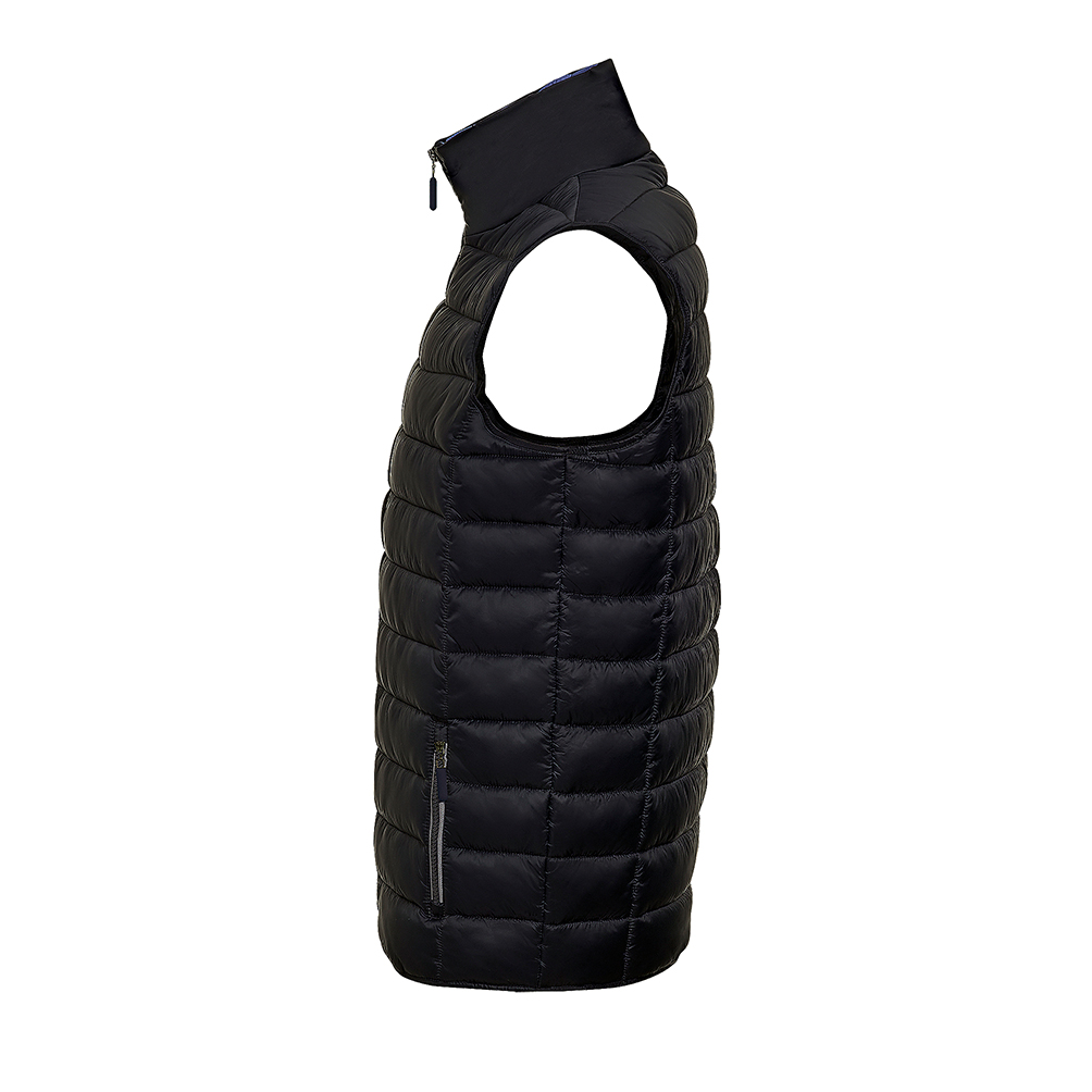 100% нейлон Подкладка из 100% нейлона Набивка: 100% полиэстер - 180 г/м² 2 кармана на молнии в цвет подкладки Воротник-стойка, приталенная модель Окантовка по низу жилета тон в тон