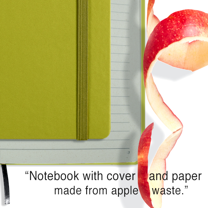 Apple ноутбук APPLE SKIN II алманын кабыгынан жасалган капкагы жана блоку, ички форматы 13x21 см. 192 бет, алма кагазы 80 г. FSC тастыкталган. 1+1 түстө басып чыгаруу, бардык барактары номерленген. Тигилген блок. Калың алма кагаздан жасалган акыркы кагаздар 140 г FSC. Ийкемдүү капкак, ийкемдүү тилке жана капка дал келген лента. Экологиялык таза жабуу алманын кабыгынын өнөр жай калдыктарын инновациялык иштетүүнү колдонуу менен жогорку сапаттагы материалдан жасалган. Бул сокур рельеф үчүн жылуулук эффективдүү касиетке ээ.