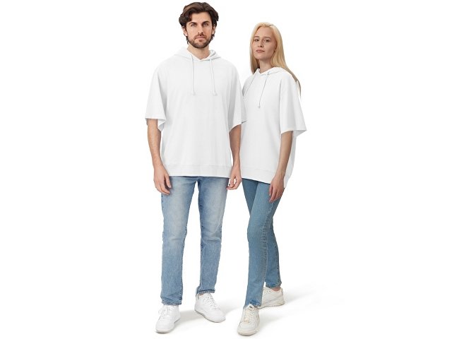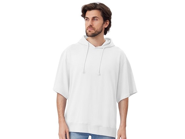 Худи с коротким рукавом выполнено из хлопкового френч терри с петельками на изнаночной стороне. Подкладка капюшона выполнена из основного полотна для объемной посадки. Модель комфортной и актуальной посадки оверсайз отлично подходит для обычной жизни и в качестве промо мерча. - оверсайз посадка - низ обработан рибом 2х2 и дополнительно отстрочен для укрепления - мягкое и качественное полотно френч терри - увеличенная зона для нанесения из-за отсутствия кармана