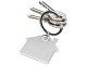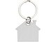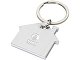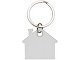 Брелок для ключей в форме домика с цветной вставкой из пластика между 2-мя серебристыми пластинами из стали.