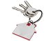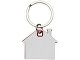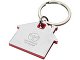 Брелок для ключей в форме домика с цветной вставкой из пластика между 2-мя серебристыми пластинами из стали.