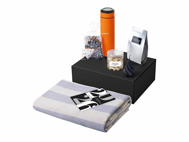Материал товара: плед - 100% хлопок, мешок - нетканый материал (спанбонд), термос - нержавеющая cталь с покрытием soft-touch, открытка - бумага