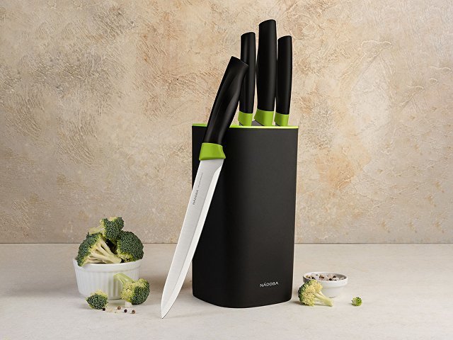 Набор ножей 5 предметов NADOBA серии Olivia состоит из: нож овощной, 9 см, нож универсальный, 12,5 см, нож разделочный, 20 см, нож поварской, 20 см и универсального блока для хранения ножей. Ножи выполнены из высококачественной нержавеющей стали с высоким содержанием углерода. Благодаря этому нож обладает высокой твердостью 52-54 HRC по шкале Роквелла и превосходными антикоррозийными свойствами. За счет пятигранного профиля и правильной толщины лезвий ножи обладают идеальным балансом и длительное время не требуют заточки. Блок нового поколения из высокопрочного пластика позволяет хранить ножи в любом количестве и произвольном порядке. Изделия можно мыть в посудомоечной машине. Гарантия на набор Olivia 5 лет.