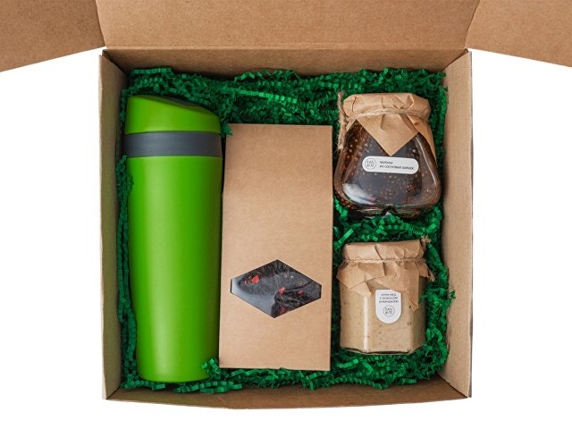 Материал товара: коробка - картон, банка - стекло, термокружка - полипропилен