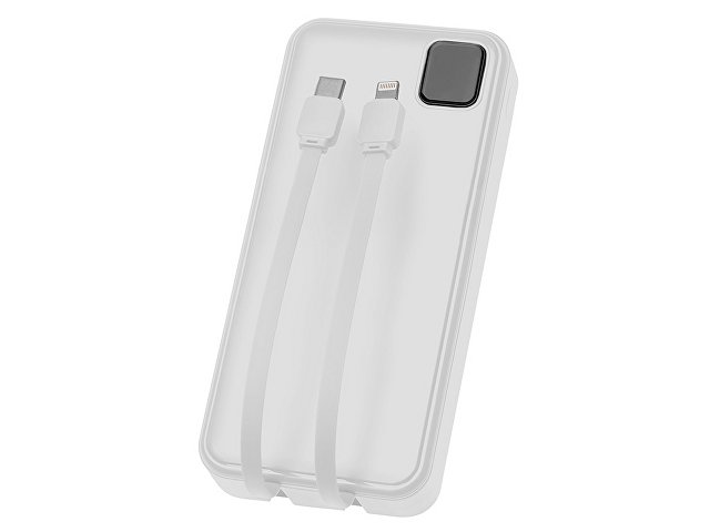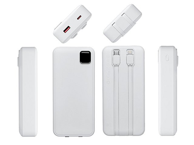 Удобный внешний аккумулятор с функцией быстрой зарядки и встроенными кабелями USB-C (симметричный разъём USB тип С) и Lightning (разъём в ранних версиях iPhone) — ваш надежный партнер в путешествиях, на встречах и в повседневных задачах. Цифровой дисплей в реальном времени показывает точный остаток заряда и статус быстрой зарядки, а встроенные кабели и несколько разъемов позволяют заряжать до 4 устройств. Прочный корпус из переработанного АБС-пластика и емкость 20000 мАч обеспечивают зарядом все ваши устройства на долгий срок. Идеальный выбор для тех, кто ценит комфорт и функциональность в одном устройстве. Продуманная упаковка: для открытия просто потяните за язычок, и появится гаджет с нанесением. - Встроенные кабели USB-C и Lightning — больше не нужно искать провода - Цифровой дисплей с точным отображением заряда - Удобная зона под нанесение логотипа - Функция быстрой зарядки, заряжает на 50% быстрее - Упаковка с удобным и быстрым открытием - До 4-5 полных зарядок смартфона