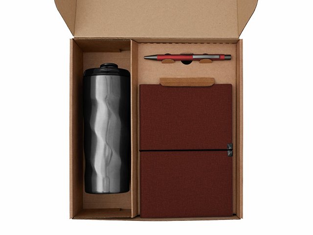 Материал товара: блокнот- искусственная кожа, бумага, ручка - металл с поверхностью soft-touch, термокружка - кружка- нержавеющая сталь, крышка- пластик, картхолдер - переработанный полиуретан, открытка - бумага, коробка- картон